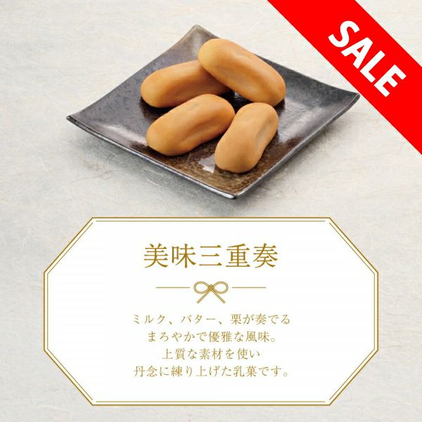 栗入りバターあん(白生あん、砂糖、麦芽糖、水あめ、栗甘露煮、加糖れん乳、その他)(国内製造)、小麦粉、加糖れん乳、果糖ぶどう糖液糖、乳等を主要原料とする食品、はちみつ、液全卵、ショートニング/トレハロース、グリシン、増粘剤(加工でん粉、増粘多糖類)、膨張剤、香料、乳化剤、カゼインNa、pH調整剤、加工でん粉、酸化防止剤(V.E)、クチナシ色素、(一部に乳成分・小麦・卵・大豆を含む) |
