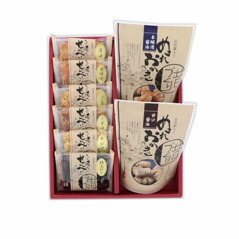 内容量 お煎餅(醤油・七味・ごま・しそ・あおさ・特上のり 各1枚)、ぬれおかき(甘口醤油・本醸造醤油 各112g入 1袋)