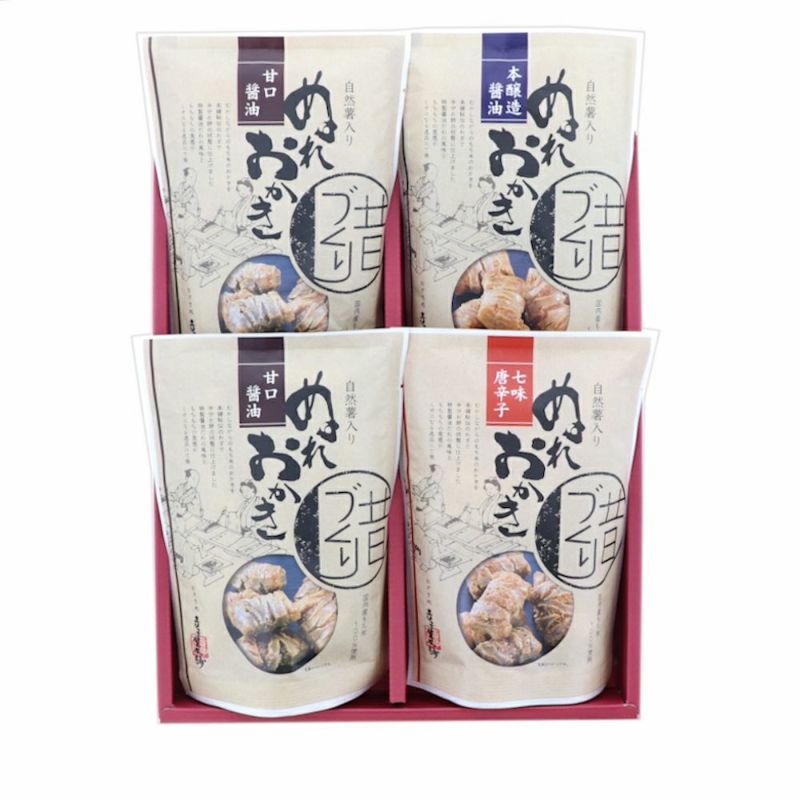 内容量 ぬれおかき(甘口醤油 112g入 2袋、本醸造醤油・七味唐辛子 各112g入 1袋)